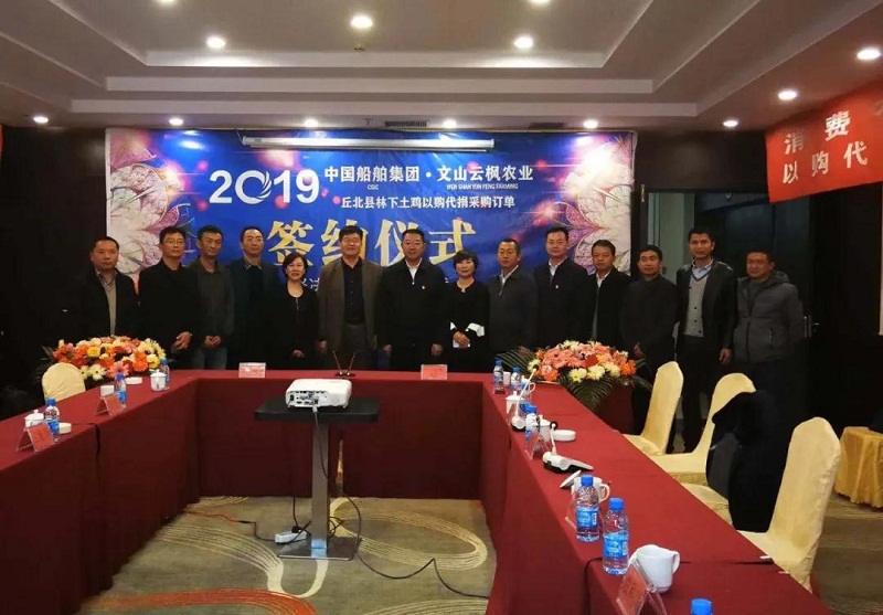 2019年12月22日,中國(guó)船舶集團(tuán)-云南文山云楓農(nóng)業(yè)丘北縣林下養(yǎng)雞“以購(gòu)代捐”采購(gòu)訂單簽約儀式在云南丘北縣舉行。