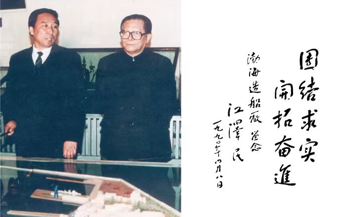 1990 年4月8日,江澤民同志視察渤海造船廠并題詞“團(tuán)結(jié)求實(shí),開(kāi)拓奮進(jìn)”。