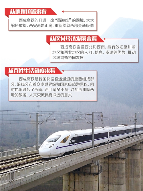 從地理位置來看,西成高鐵將一改“蜀道難”的困境,大大縮短成都、西安兩地距離,重新繪就西部交通版圖。從區(qū)域經(jīng)濟(jì)發(fā)展來看,西成高鐵連通西北和西南,能有效匯聚川渝地區(qū)和西北地區(qū)的人力、信息、資源等優(yōu)勢,推動(dòng)區(qū)域均衡協(xié)同發(fā)展。從百姓生活角度來看,西成高鐵是我國快速客運(yùn)通道的重要組成部分,沿線分布著眾多世界級(jí)和國家級(jí)旅游景區(qū),對(duì)加深川陜兩地的旅游、人文交流具有深遠(yuǎn)的意義。