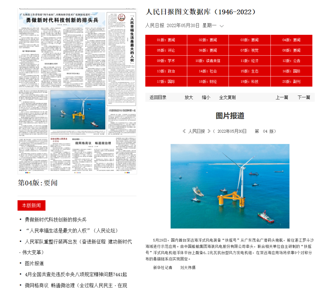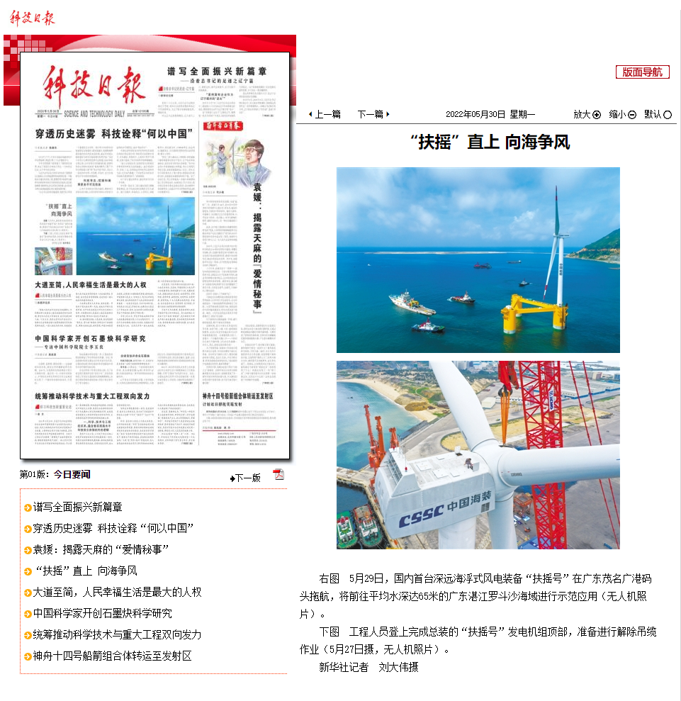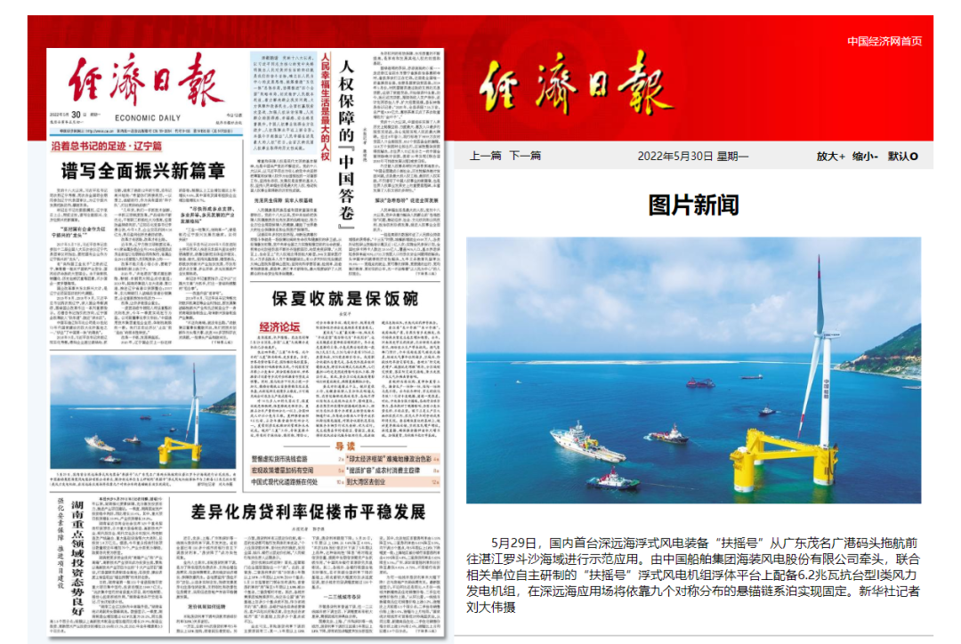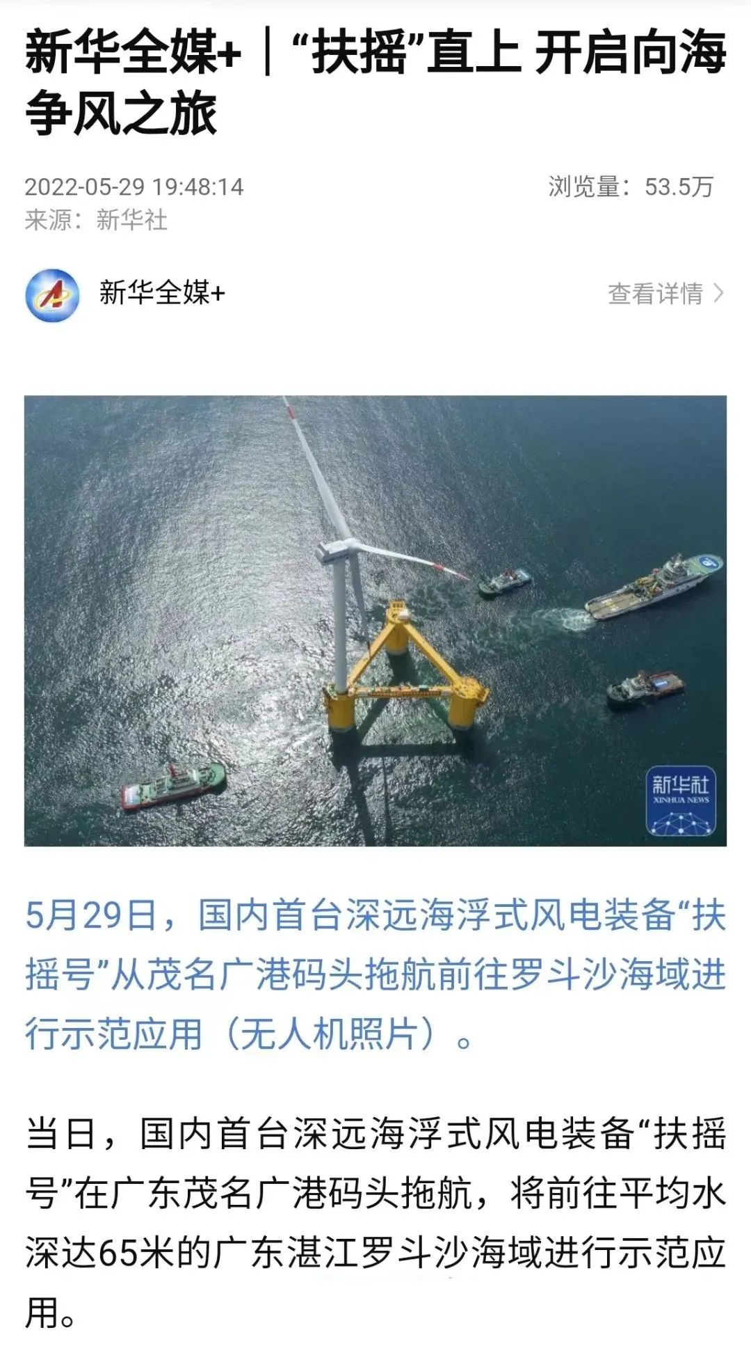 5月29日,中國船舶集團旗下中國海裝牽頭研制的國內(nèi)首臺深遠海浮式風(fēng)電裝備——“扶搖號”從廣東茂名碼頭起航,前往平均水深65米的廣東湛江附近海域投入示范應(yīng)用。